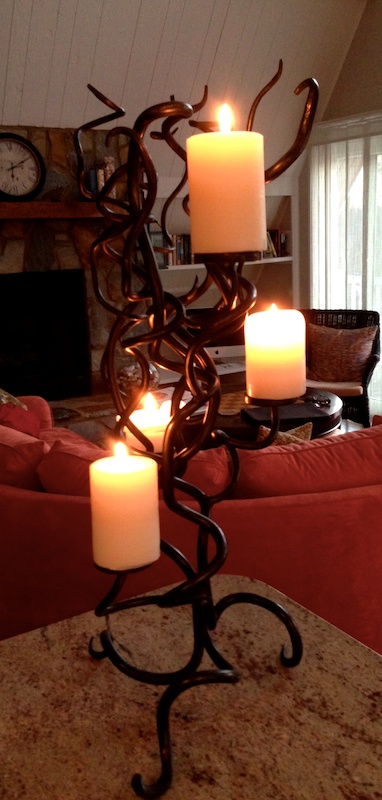 D’s Candelabra: Fast and quick, that is how it feels when I watch the light move around this sculpture. You can almost feel the heat rising up off of the top. The heating and beating and bending can really eat up a day, but it is well worth it to find that sweet smooth curve that demands you run your hand over it. 12 x 12 x 28 2013